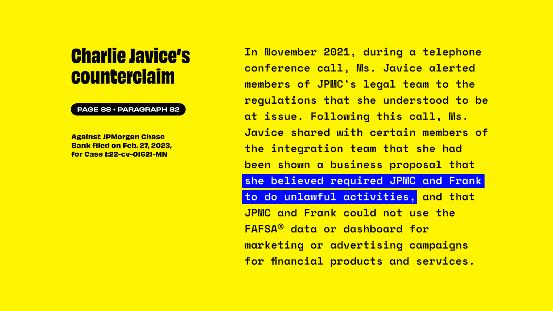 But JPMorgan counters that Frank explicitly pitched itself to potential investors as a sales machine for banking products, boasting about the streamlined onboarding process it offered thanks to the valuable data entered into its FAFSA tool.