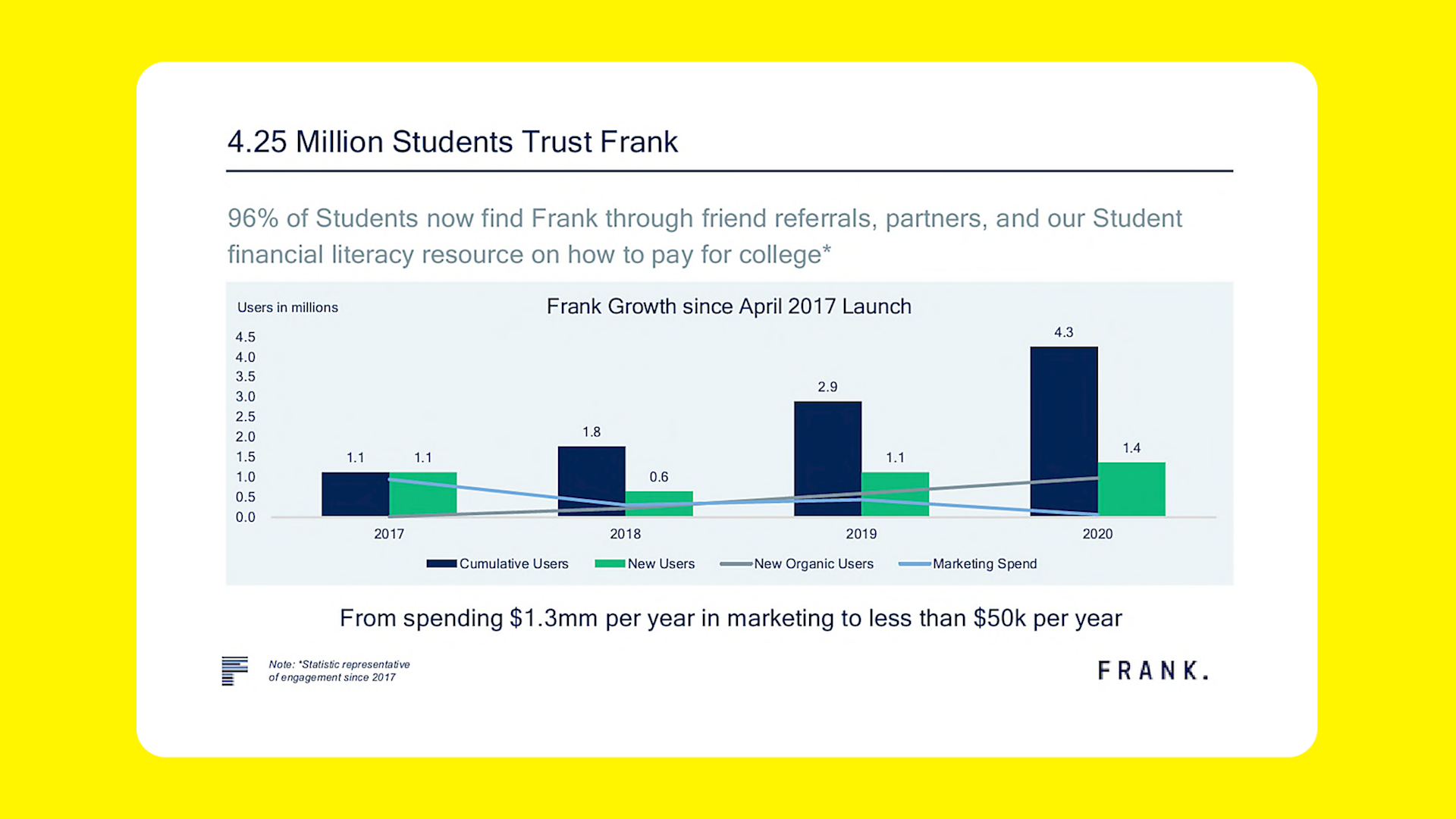 The bank claims Charlie’s company Frank repeatedly represented that it had 4.25 million users, filing multiple exhibits with the court to support this point, including the pitch slide below.