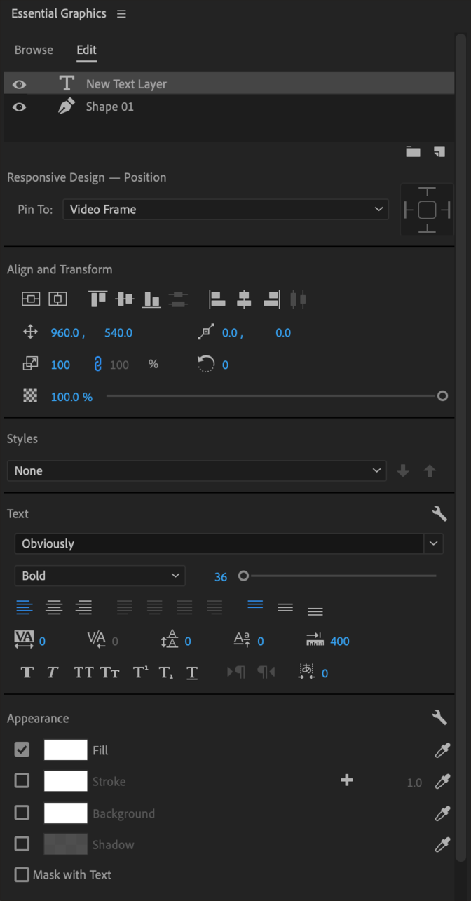 Edit titles & graphics. Click a text or shape layer in the list at the top of Essential Graphics to edit its settings below.