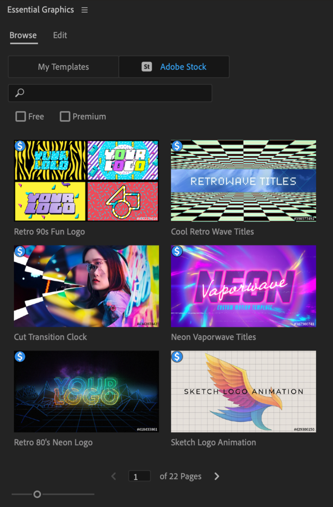 Browse motion graphic templates (a.k.a. mogrts) by going to Essential Graphics → Browse tab → Adobe Stock.